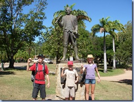 Goeie wind, vlak water, dus we liepen sneller dan gemiddeld en ankerden ruim voor zonsondergang in de baai van Portland Road. Portland Road is een gehuchtje waar 7 huizen staan en geen gsm-netwerk noch internet is. Twee pensionnetjes, één restaurantje (dat ‘s avonds gesloten is), drie gewone huizen en een huis dat te koop staat. De eigenaar van één van de pensionnetjes kwam een babbeltje slaan. Of hier nog iets te zien was, vroegen we. Buiten de twee openbare telefooncellen daar, staat hier niets opmerkelijks, zei hij. ‘Pure isolation’. ‘Ah, en pas op als je de dinghy terug in het water legt. Er zit hier een grote krokodil van 4 meter lang.’